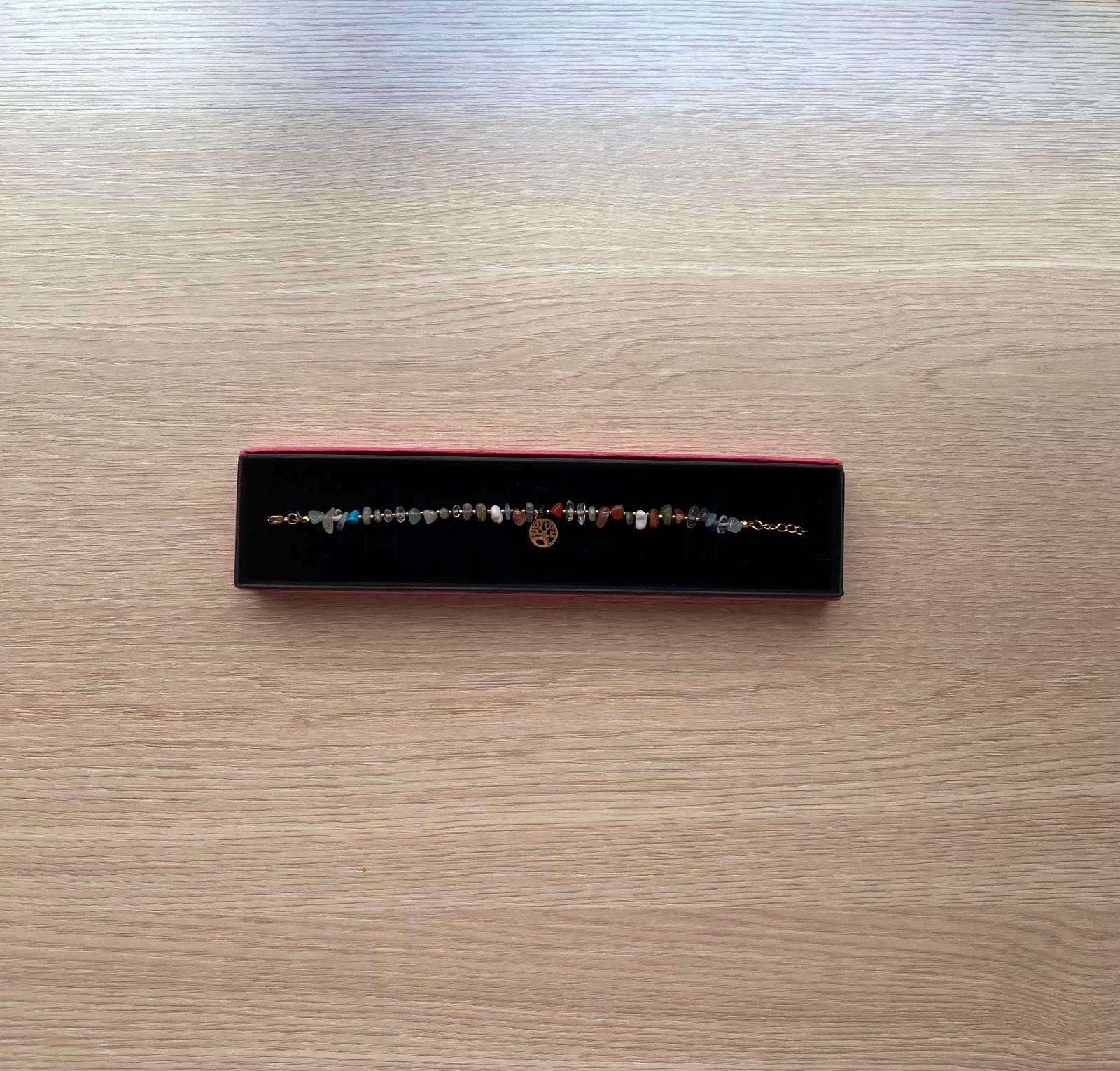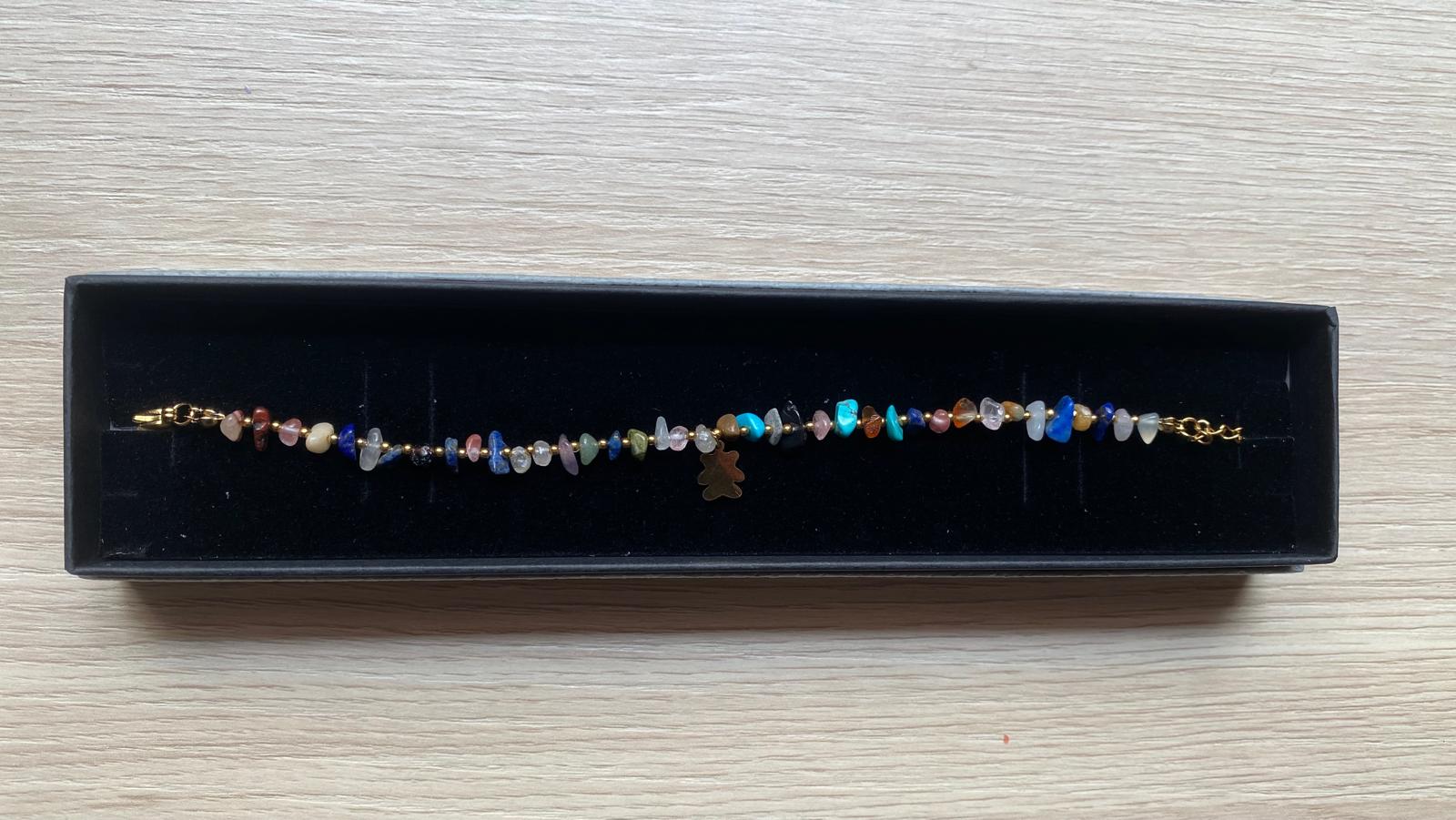 Pulsera de piedras multicolor con osito, trébol o árbol dorado. De acero inoxidable.